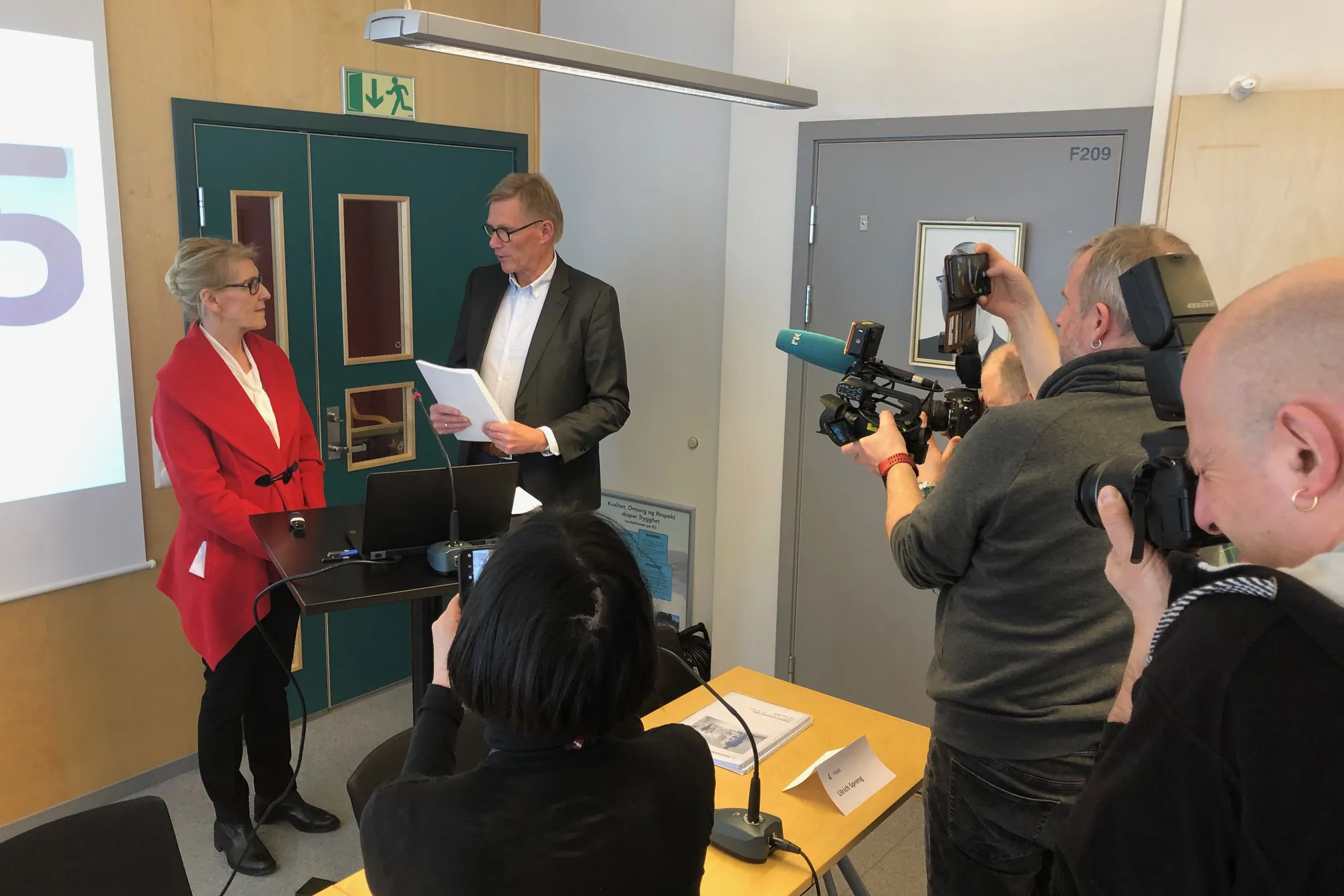 Leder for den eksterne ressursgruppa, Helge Torgersen, overleverer den endelige rapporten til administrerende direktør Hulda Gunnlaugsdottir.